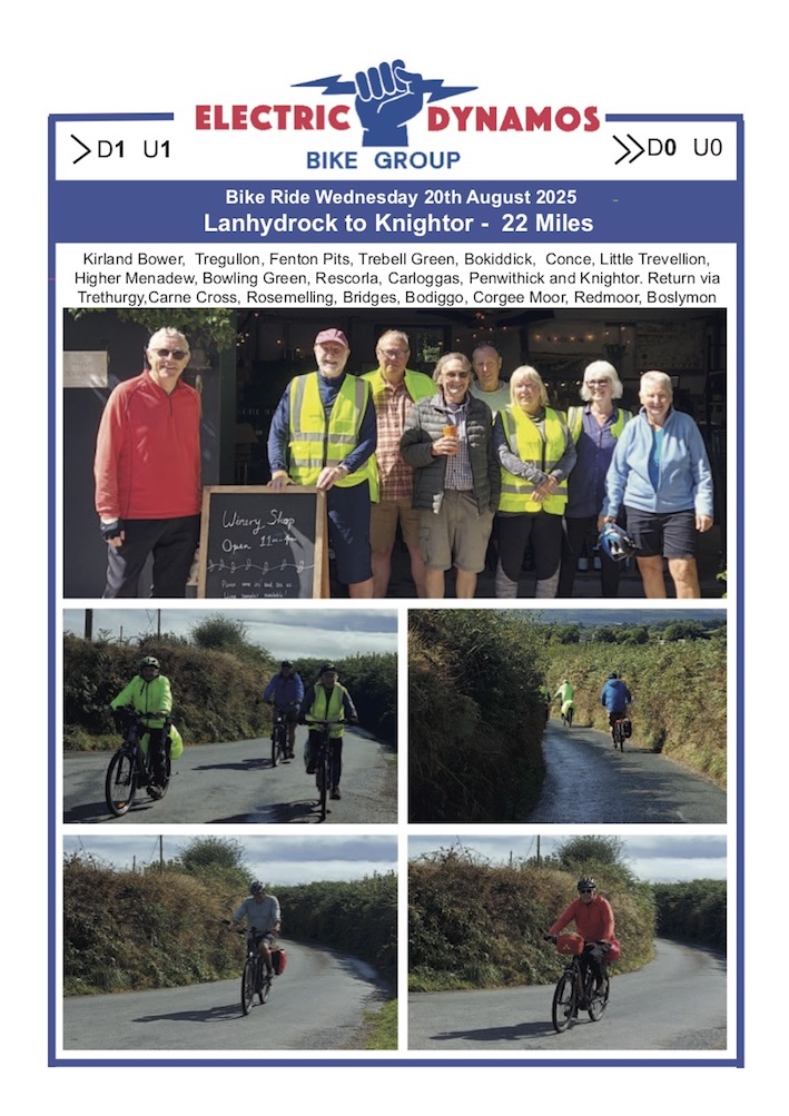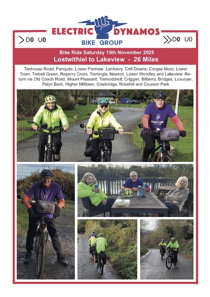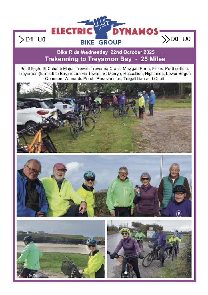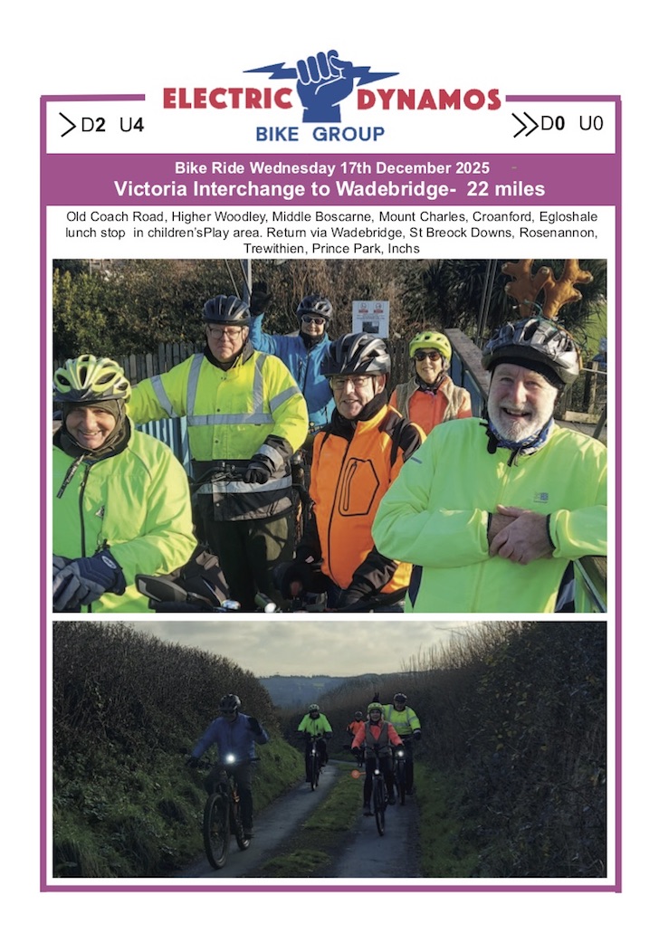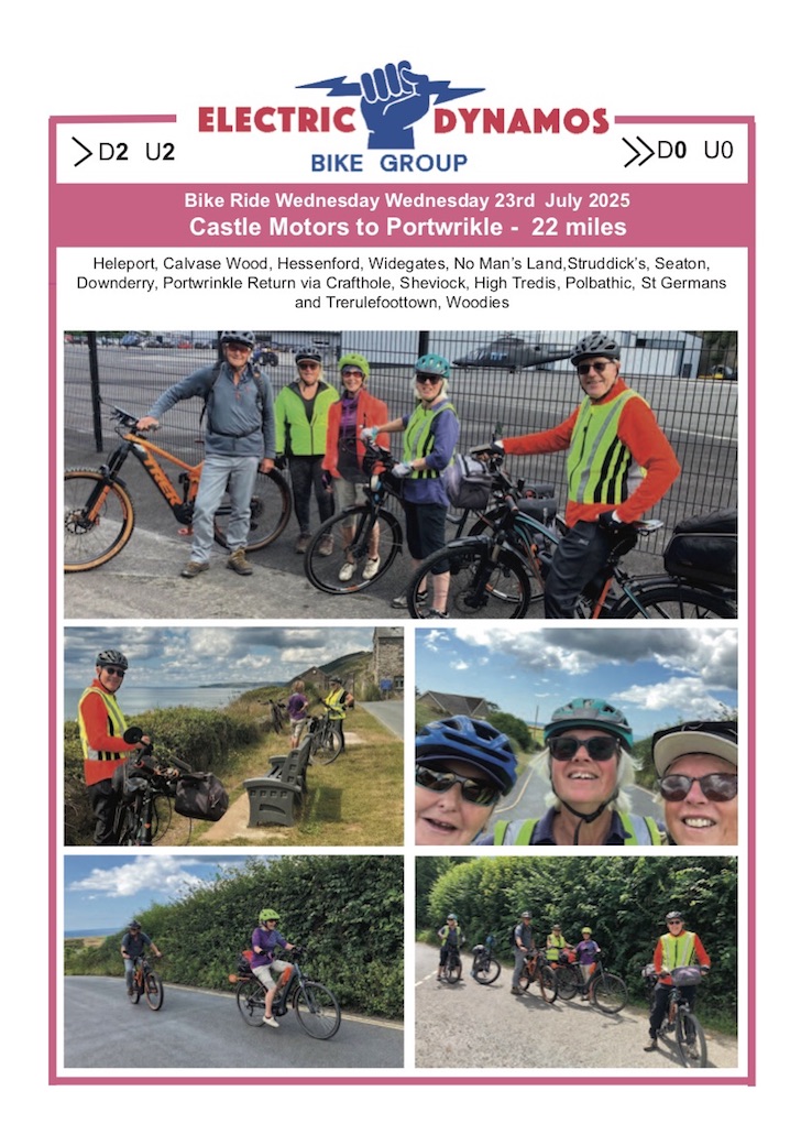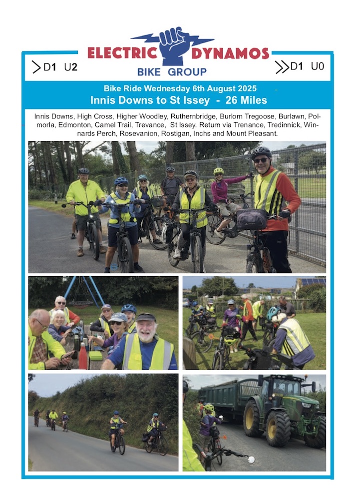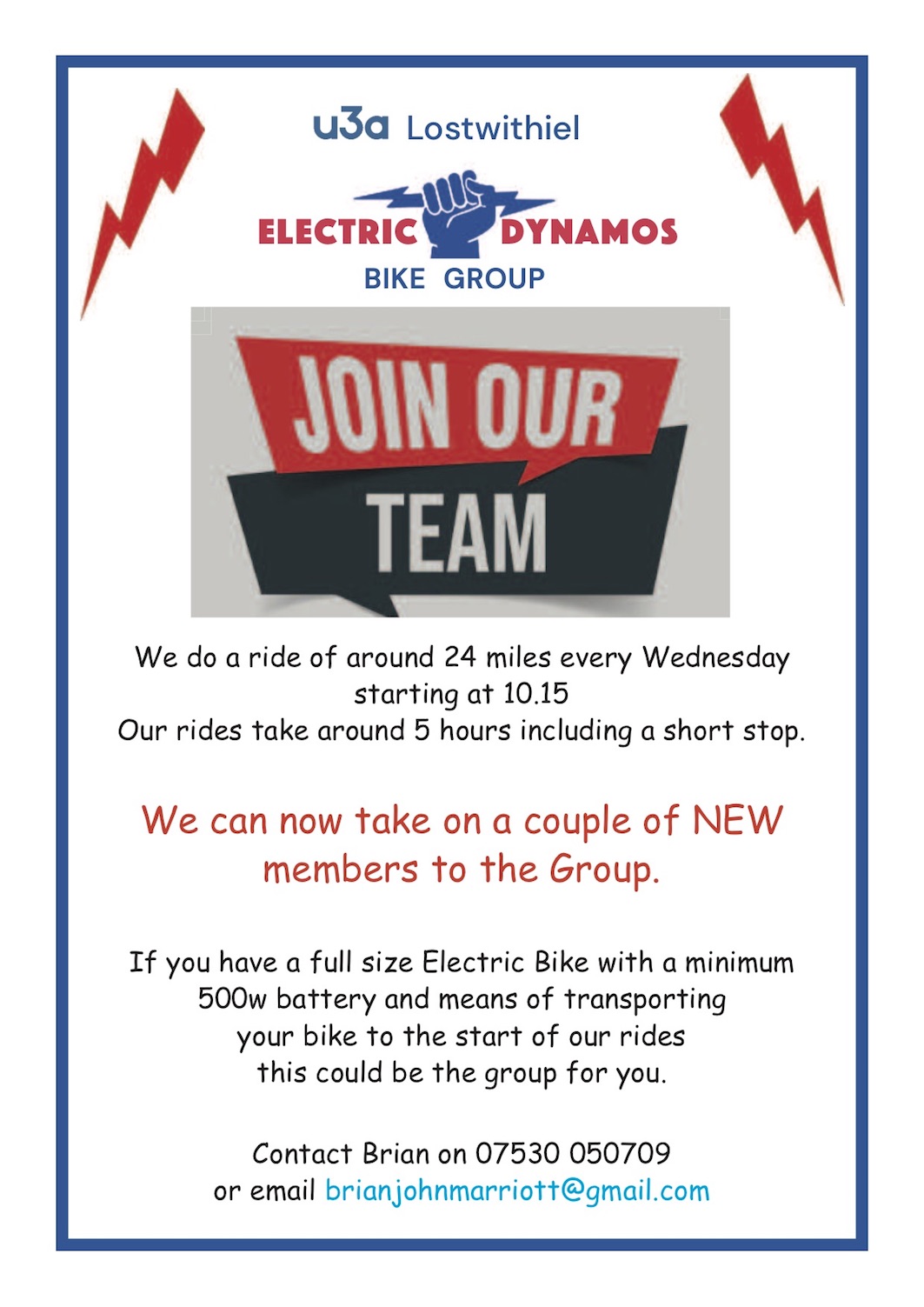 All of our riders now have Electric Bikes which means that we can cycle further and don't have to bother about hills. At the moment we are trying to do a ride every week usually on Wednesday's. For further information please read the notice on our Group Home Page.