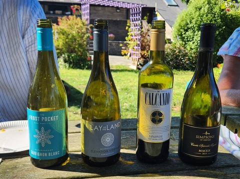 Al fresco again with an interesting selection chosen by Jill. She selected from online suppliers Naked Wines. Two wines stood out for me the rather bland and expensive NZ Sauvignon at £16 Lay of the Land and the best by far was the French Syrah "Simpsons of Servian " at £10. As to the other two least said...